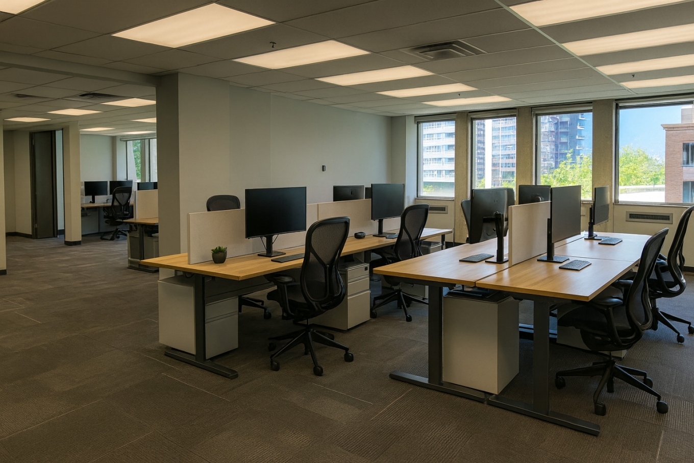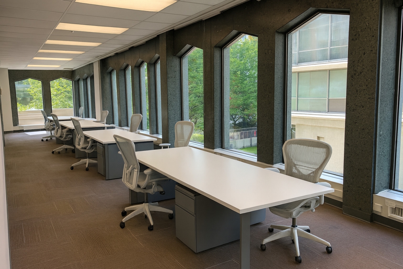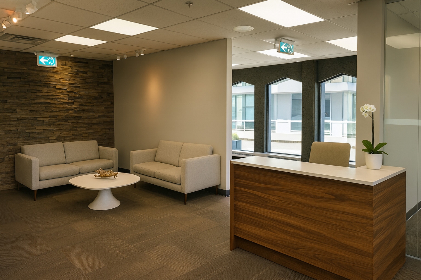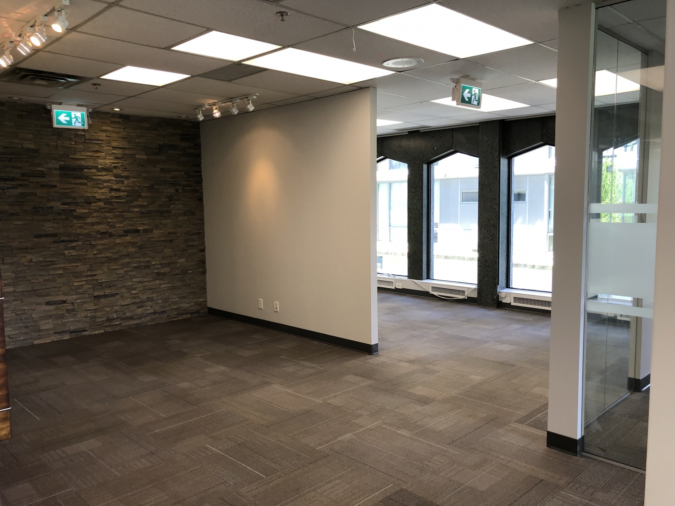 Description : Well improved office corner office suite with window exposure on three sides and some views to the North. Reception, 3 offices, boardroom, kitchen and open work areas. Pics include virtual staging.